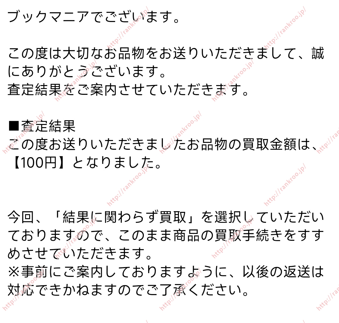 ブックマニアは高額買取と謳っているのに買取は安く返送料金は高くでは、リピーターもいなくなりますよ。正直同じ商品を他のまんが買取店で査定してもらったらどのくらいになるのかは分かりませんが、ブックマニアよりは高く見積もってくれると思うのですが…。私の意見も参考にしてくれればと思います。
