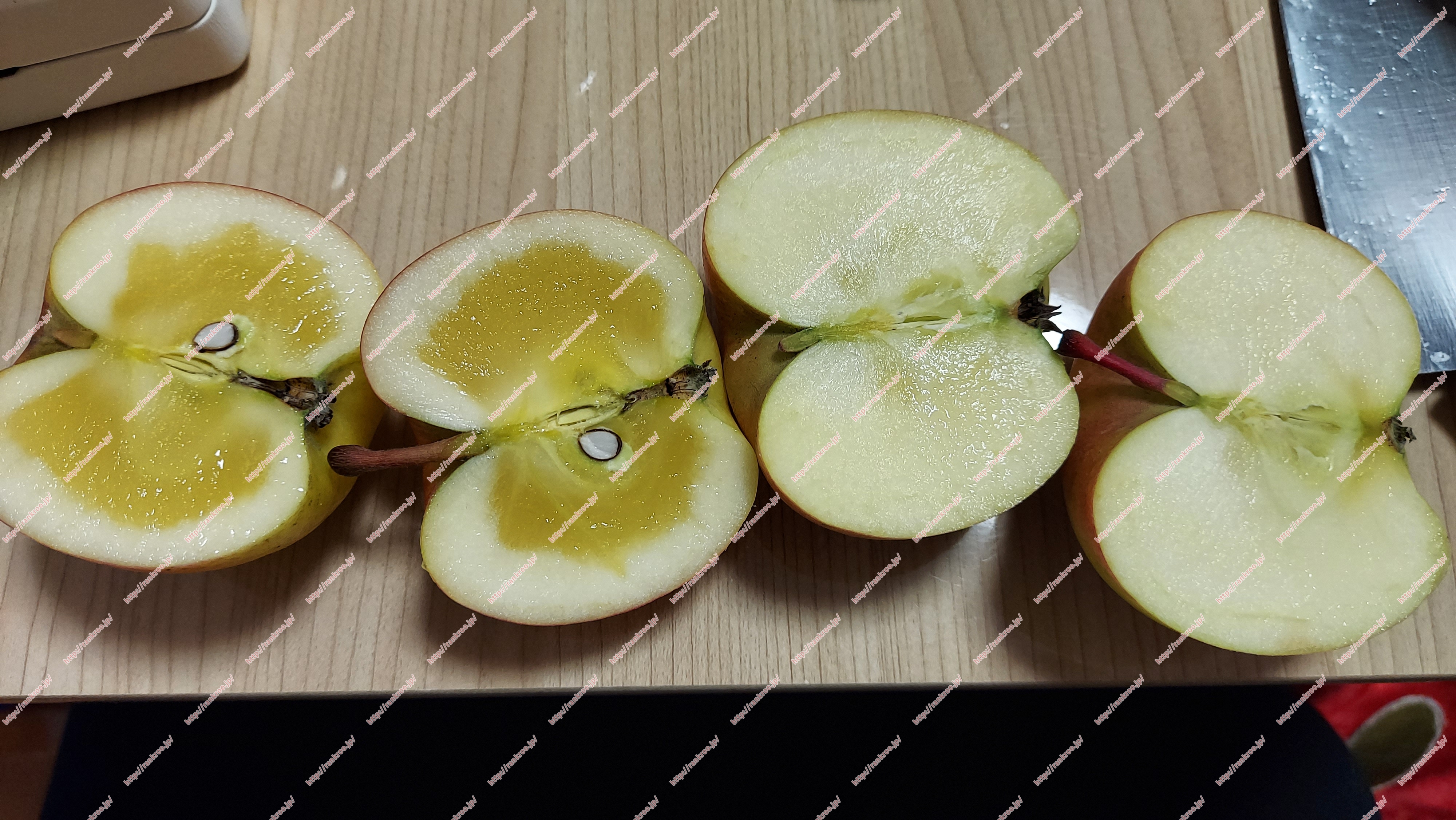 蜜入りりんご 『こみつ(品種:こうとく)』青森県石川地区産 約2kg(10〜12玉) ※常温を購入し、昨日商品が届いたので7個割ってみたところ密はなく実もスカスカでした。同時期に北陸の青果店で購入したこみつは密もたっぷりで、あまりの違いに二つを並べて写真を撮りました。送っていただいたこみつは特選ランクで、青果店で購入したこみつは秀ランクです。青果店で、この話をしたところ、長期保管のりんごを送ってる可能性大と仰有ってました。密が少なくなる時季になったとは言え、同じこみつの会のりんごとは思えないです。このような商品を販売することは生産者様と消費者様両方から信用を失くすことでしょう。掲載写真を信じて贈答品として選ばずに正解でした。今回は2箱購入で高い勉強代になりましたが、来季は青果店での購入のみにしようと思いました。